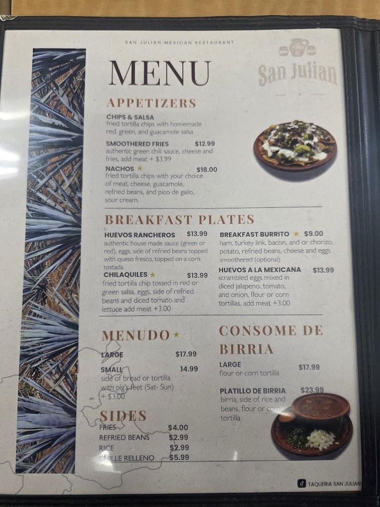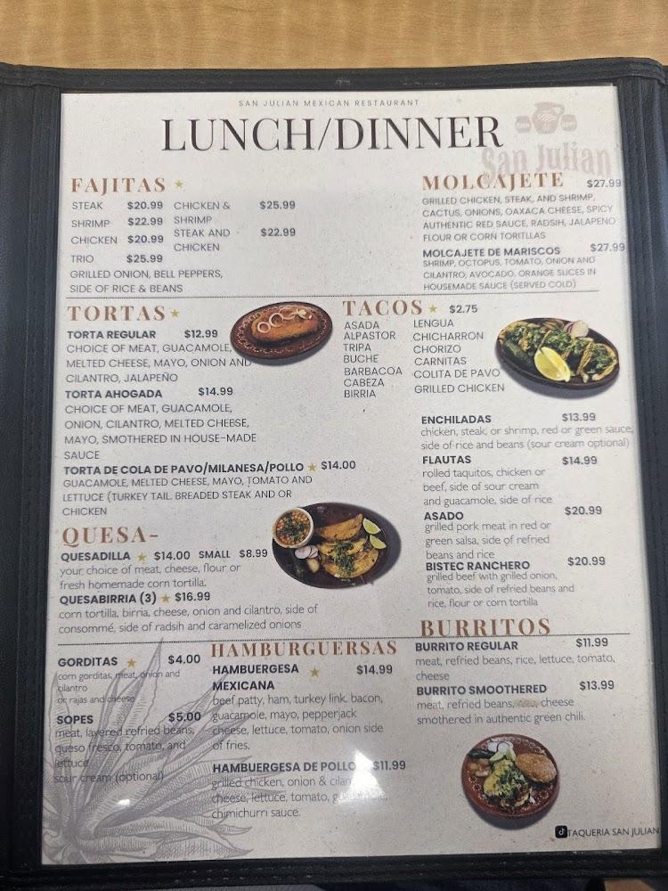 The menu at San Julian is diverse, showcasing traditional Mexican cuisine. Options include classic burritos, enchiladas, and a variety of tacos. Specials like quesabirria and menudo highlight authentic flavors that many diners love.